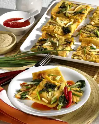 Mix flour, milk, eggs, salt, Chinese spice and 200 ml water to a pancake batter. Leave to swell for 15 minutes. In the meantime, clean and wash the Pak-Soi, cut larger leaves into small pieces.