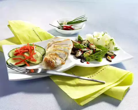 Add the asparagus, shiitake and chili to the broth and fry for 3 minutes. Season to taste with salt. Arrange the cauliflower on a plate and sprinkle with chives. Add the asparagus vegetables. Cut the meat open and arrange on the plate with cucumber and paprika salad.