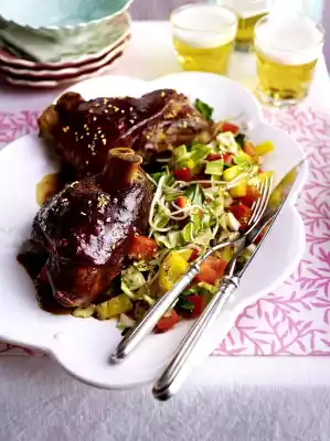 Cut cabbage into quarters, cut out the hard stalk. Clean and wash the cabbage and cut into bite-sized pieces. Drain the cabbage. Clean, wash and chop the peppers. Leek onions clean, wash and cut into pieces. Rinse and drain the sprouts. Mix 100 ml soy sauce, honey and sambal oelek. Coat the knuckles with it about 15 minutes before the end of the cooking time. Roast the knuckles brown, if necessary increase the oven temperature (electric cooker: 225 °C/ circulating air: 200 °C/ gas: see manufacturer). Check the knuckles regularly!