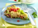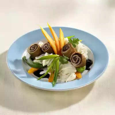 Place the rolls in a bamboo basket or steamer pot and steam over boiling water for 15-20 minutes. Add 100 ml of water and soy sauce to the remaining plum sauce and reduce slightly. Clean, peel and slice the carrots lengthwise. Clean and wash spring onions. Blanch the vegetables in sparkling salted water for 2 minutes, remove from the cooking water and keep warm. Put the noodles in the salt water and cook for 3-5 minutes. Remove the rolls from the bamboo basket, cut them in half and serve with vegetables, sauce and noodles. Serve garnished with coriander leaves
