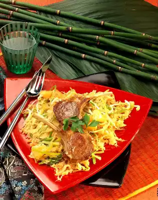 Pour in pineapple juice and braise for 15-20 minutes. Season to taste with soy sauce, tabasco and salt. In the meantime, wash lamb chops, pat dry and season with salt and pepper. Heat 1 tablespoon of oil in a pan.