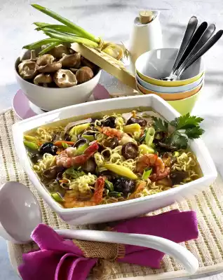 Cook the pasta in boiling salted water for about 5 minutes. Pour noodles onto a sieve, drain and add to the soup. Add prawns. Season shiitake pot with soy sauce and sambal oelek. Serve garnished with parsley.