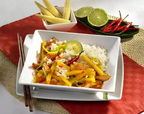Brown the turnip strips in it, deglaze with broth. Stir in the Asian sauce and cook for about 8 minutes. Add spring onions and corn and cook for another 5 minutes. Season with soy sauce and lime juice. Serve with the rice in portions. Serve garnished with a slice of lime and chilli pepper