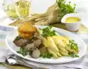 In the meantime, heat the remaining oil in a pan and fry the meat in 2 portions. Finally add vegetables, braise briefly and deglaze with chicken stock. Add ketchup and simmer for about 2 minutes.