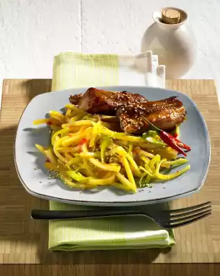 Turn the ribs once. Mix honey and 1 tablespoon ketchup and spread the ribs with it 5 minutes before the end of the frying time. Cut the turnip into thin slices, peel and cut into fine strips.