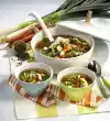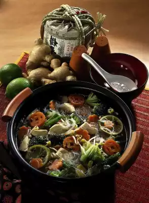 Bring the stock to the boil again and cook the prepared vegetables in it for five minutes until al dente. Heat the glass noodles, bean sprouts, spring onions and chicken in the stock. Squeeze the lime half. Season stew with salt, soy sauce and lime juice.