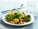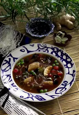 Browd glass noodles with boiling water and let them drain. Remove the chicken meat from the stock. Cook the peas, peppers, spring onion and mushrooms for about 7 minutes in the broth. Cut the chicken meat into slices.