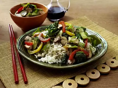 In der Antihaftpfanne bei großer Hitze 3 Minuten unter einmaliger Wendung anbraten. Beiseite stellen. Zum Kochen Brokkoli, Paprika, Zuckerschoten, Bok Choy und ¼ Tassenwasser hinzufügen. Kochen, bis das Wasser verdampft ist, dabei gelegentlich schwenken.