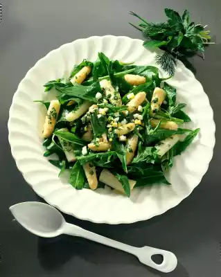 Wash the dandelions and divide into bite-sized pieces. Arrange salad and asparagus on a plate and pour the marinade over them.