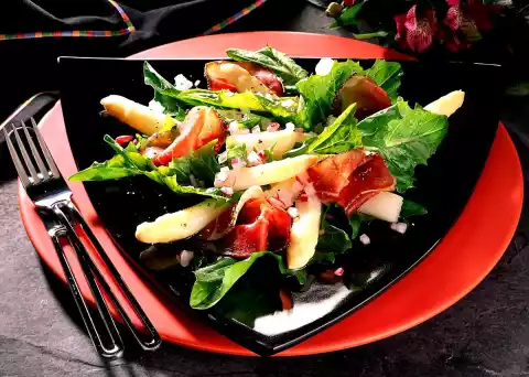 Drain the asparagus and let it cool down a little. Use the asparagus water later for a soup. Arrange on plates with the dandelion salad and the ham. Pour marinade over them.