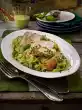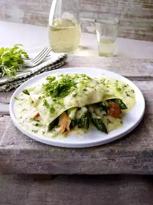 Pick salmon. Grease a grease pan of the oven. Place the lasagne plates one by one on top, cover half of them with some asparagus and half of the salmon, drizzle some sauce over them and fold them over. Use the rest of the lasagne sheets in the same way. Spread the rest of the sauce over the lasagne sheets. Sprinkle with cheese and bake in the preheated oven (electric cooker: 200 °C/ convection oven: 175 °C/ gas: level 3) for approx. 12 minutes. Remove from the oven and arrange on plates sprinkled with remaining chervil