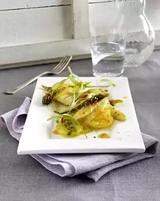 Clean and wash spring onion and cut into thin strips. Heat the oil in a pan and fry the asparagus for about 8 minutes while turning. Add sesame, chilli sauce and vinegar, season with salt. Mix potatoes, stock and asparagus and let it stand for about 30 minutes. Arrange salad with strips of spring onions on plates