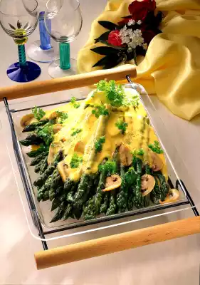 Beat butter over low heat until it melts. Place the asparagus in an ovenproof dish. Pour sauce over it. Sprinkle with cheese and bake in a preheated oven (electric: 225 ° C/ gas: level 4) for about 5 minutes.