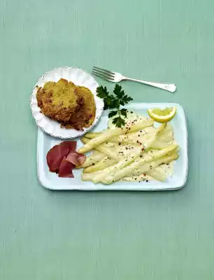 potato mixture, form into 4 small Rösti and fry over a low heat for approx. 5 minutes. Turn the Rösti halfway through the frying time. Keep the finished Rösti warm. Fry the remaining 12 Rösti with 2 tbsp. oil in the same way. Arrange asparagus, Rösti, remaining ham and lemon wedges. Sprinkle with pink berries