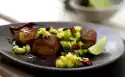 In the meantime, wash the prawns and dab them dry. Heat 2 tablespoons of oil in a large frying pan. Fry the prawns in it all around for about 3 minutes. Season with salt and pepper. Remove the asparagus from the oven and spread the prawns on top.