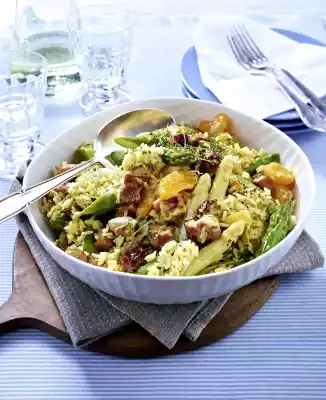 Prepare rice in boiling salted water according to package instructions. Pour mandarins into a sieve, collect the juice. For the sauce, mix yoghurt, salad cream, vinegar and 6 tbsp. mandarin juice. Season to taste with curry, salt and pepper