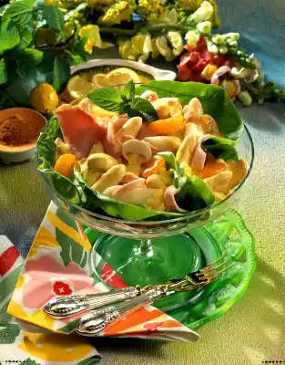Also drain the mandarins and collect the juice. Clean and slice the mushrooms. Cut 4 slices of smoked pork loin into strips. Mix crème fraîche, 2 teaspoons of curry, 1 tablespoon of lemon juice, 3 tablespoons of mandarin juice, some salt, pepper, sugar and Worcester sauce.