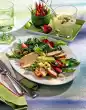 Fold asparagus, up to 8 tips, mushrooms and mandarins into the sauce. Allow to soak a little. In the meantime clean, wash and drain the salad. Roll up the remaining slices of smoked pork loin into small bags and put them into 1 asparagus tip each.