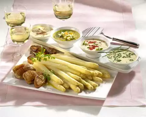 Heat 50 g butter and sauté flour in it. Stir in asparagus stock and milk, bring to the boil. Simmer the sauce for about 5 minutes. Cook the asparagus in boiling, lightly salted water, covered with 1 teaspoon sugar, for 20-25 minutes