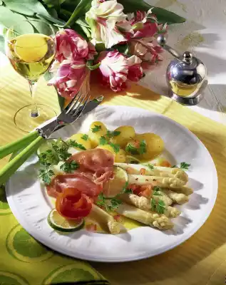 Clean, wash and chop the tomatoes. Mix lemon juice, salt, pepper, sugar and oil. Pour over the asparagus. Peel and rinse the potatoes. Serve with asparagus, tomato, ham and chervil