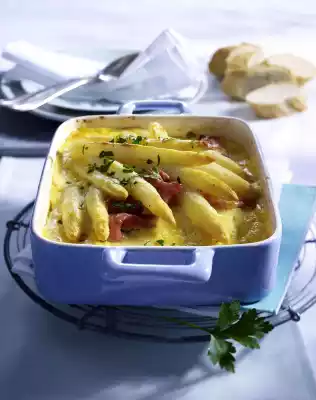 Place the asparagus and ham alternately in a greased large casserole dish, pouring a little hollandaise sauce over each. Finish with the sauce. In a preheated oven (electric cooker: 200 °C/circulating air: 175 °C/gas: level 3) approx.