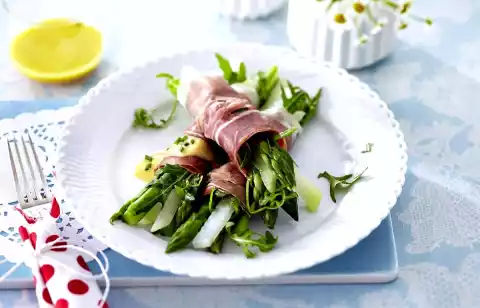 Season to taste with salt, pepper and sugar. Loosely mix asparagus, kohlrabi, rocket and egg white. Drizzle 2 tbsp. olive oil and 1 tbsp. lemon juice over it, season with salt and pepper.