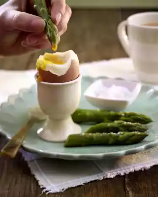Arrange asparagus and eggs. Open the eggs, season with sea salt and dip the asparagus tips in the egg yolks