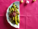 Lift out with a skimmer and let it drip off on kitchen paper. Keep baked asparagus warm in the oven (electric cooker: 150 °C/ circulating air: 125 °C/ gas: level 1). In the meantime, wash the salad, drain and pluck into bite-sized pieces.