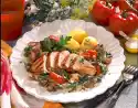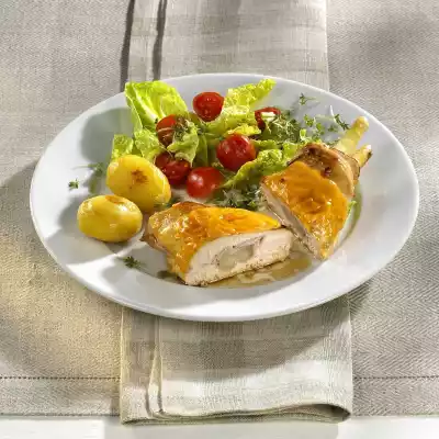 Serve chicken filet with potatoes and salad, sprinkle with cress.