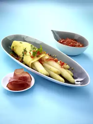 Bake 4 thin crêpes one after the other. Spread the asparagus spears evenly over the crêpes. Whip the crêpes around the asparagus spears. Spread tomato salsa on top. Add the ham. Garnish with the rest of the chervil.