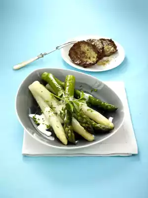 Add tarragon to the sauce and season to taste with salt, pepper and ##muscat##. Arrange asparagus with tarragon sauce on plates. Garnish with tarragon. Add schnitzel.