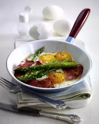 Remove and fry the asparagus in the ham fat for 1-2 minutes. Beat the eggs in the pan and add the ham. Season with pepper. Let the eggs fry.