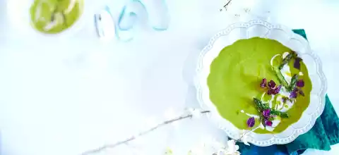 Wash the asparagus and cut off the woody ends. Cut the asparagus into pieces, leaving the asparagus tips aside. Peel and finely chop the onions and garlic. Heat 1-2 tablespoons of oil in a large pot. Sauté the asparagus, onions and garlic for about 2 minutes, dust with sugar and allow to caramelize slightly, deglaze with vinegar. Add deep-frozen peas, 1 teaspoon salt and a little pepper, pour on broth and simmer covered for about 15 minutes.