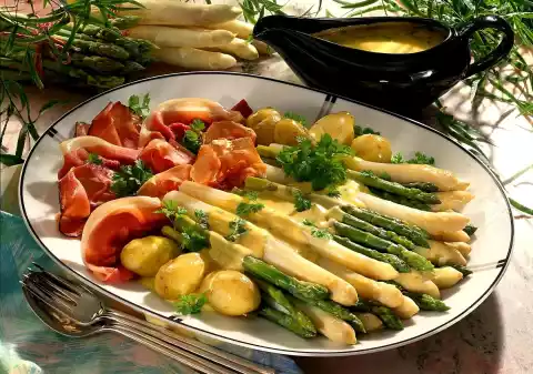 Drain the asparagus. Drain potatoes and steam briefly. Serve with the ham. Pour some chervil-hollandaise sauce over the asparagus. Garnish with the remaining chervil. Add the rest of the sauce.