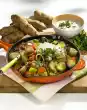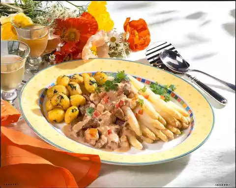 Scrape off the potatoes with a small kitchen knife, wash and cook in boiling salted water for about 15 minutes. In the meantime, peel the asparagus and cut off the woody ends. Bring water to the boil, season with salt, sugar and nutmeg and add 1 tablespoon of fat. Cook the asparagus for about 15 minutes. Wash pork, chicken and beef fillets, dab dry and cut into medium-sized cubes. Peel and finely dice the onion.
