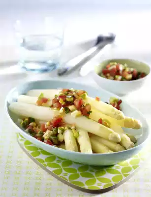 Carefully remove the asparagus from the cooking water with a skimmer. Arrange asparagus and salsa on a plate.