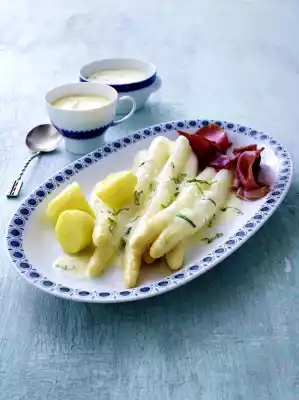 For the hollandaise bag contents, stir into 125 ml cold water with a whisk. Bring to the boil briefly while stirring. Switch off the heat. Cut 50 g butter into pieces and fold in. Stir in 75 g cream. Cut the vanilla pod lengthwise and carefully scrape out the pulp with the back of a knife. Add the vanilla pulp to the hollandaise, use the vanilla pod for other purposes. Arrange asparagus, potatoes, sauce and ham