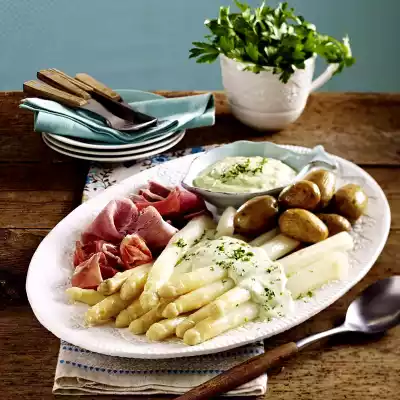 Wash parsley, shake dry, pluck off leaves and chop finely. Drain the potatoes, lift the asparagus out of the water. Arrange both with the ham and sauce on a serving dish. Pour parsley over the sauce
