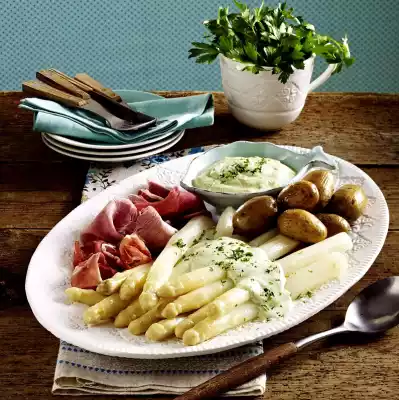 Wash parsley, shake dry, pluck off leaves and chop finely. Drain the potatoes, lift the asparagus out of the water. Arrange both on a serving dish with the ham. Pour some sauce over the asparagus. Add the rest of the sauce. Sprinkle parsley over the sauce