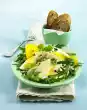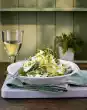 Meanwhile wash the asparagus, cut off the woody ends. Halve the asparagus. Put the upper halves aside. Cut lower halves into very fine slices. Put asparagus slices in boiling salted water and cook for about 2 minutes. Pour into a sieve and drain well