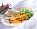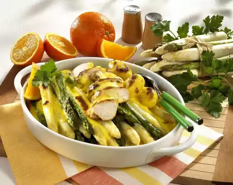 Spread the potatoes and chicken fillets around the asparagus. Pour orange-hollandaise sauce over it. Cook in the oven under the preheated grill for about 5 minutes. Serve garnished with parsley and orange wedges.