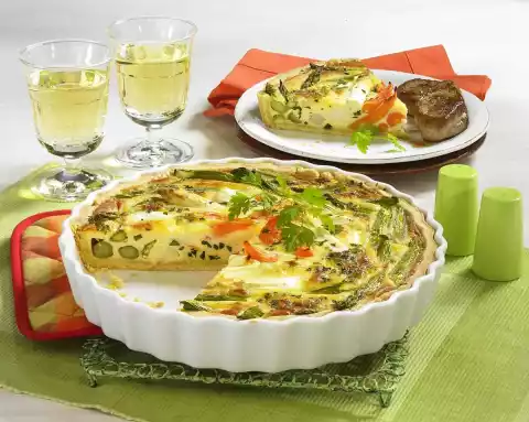 Peel and clean the carrots. Wash asparagus, cut off woody ends. Peel the white asparagus. Cut asparagus and carrots into pieces of about 6 cm. Mix cheese and eggs. Season to taste with salt, pepper and nutmeg. Stir in herbs. Spread the vegetables evenly on the base. Pour egg icing over the vegetables. Bake on the bottom shelf in a preheated oven (electric cooker: 200 °C/ convection oven: 175 °C/ gas: level 3) for approx. 50 minutes. Wash the meat, pat dry and season with salt and pepper.
