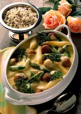 Bring stock and sugar to the boil. Add the asparagus and cook for about 15 minutes. Pour stock through a sieve into a pot. Add cream, wine and lemon peel and bring to the boil. Season to taste with salt, pepper and nutmeg. Stir in the sauce thickener and bring to the boil