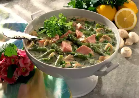 Clean, wash and quarter the mushrooms. Heat the fat in a pot. Brown the sausage and mushrooms in it. Dust with flour, sweat and deglaze with 1/4 l asparagus stock and milk. Bring to the boil and simmer at medium heat for about 5 minutes.