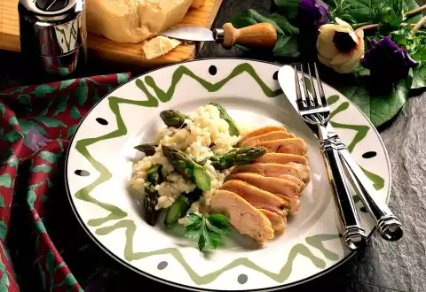Cut chicken fillets into thin slices, garnish with parsley and serve with the asparagus risotto. Sprinkle grated Parmesan cheese over the chicken.