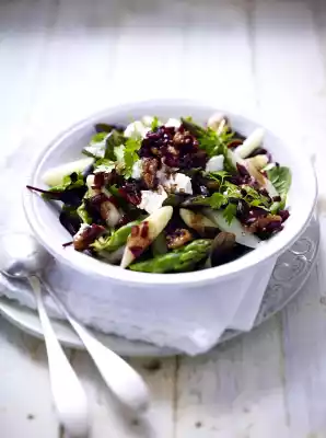 Clean and wash the salad and drain well in a sieve. Mix vinegar, salt, pepper and 1 pinch of sugar. Fold in 2 tablespoons of olive oil. Mix asparagus, salad and vinaigrette. Crumble cream cheese over it and sprinkle with walnut and onion vinaigrette. Garnish with chervil