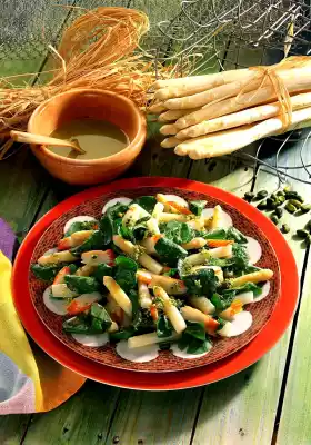 Wash and sort watercress. Chop the pistachios. Mix vinegar, salt and pepper and add oil. Add the pistachios to the vinaigrette. Drain the asparagus. Pour the vinaigrette over the prepared salad ingredients and mix everything well.