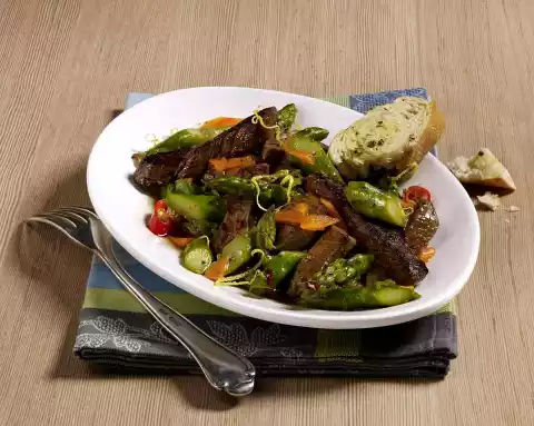 Wash the asparagus, cut off the woody ends. Peel and wash the carrot, quarter it lengthwise and cut it into slices at an angle. Cook asparagus and carrots in boiling salted water for six minutes until al dente.
