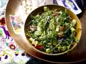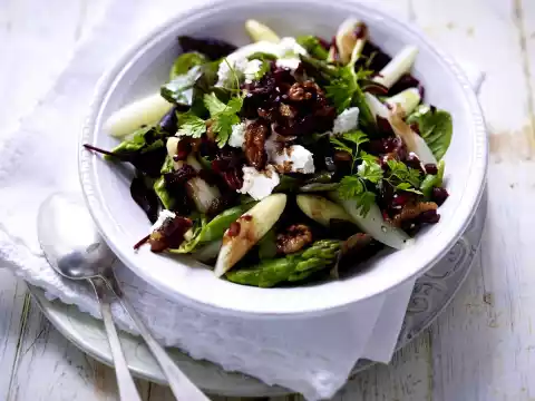 Mix asparagus, salad mix and vinaigrette and serve. Crumble the goat's cheese over it, add the caramelized onions and sprinkle with chervil. Baguette tastes good with it.
