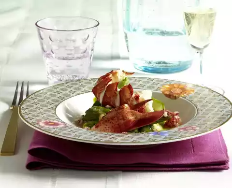 Add oil drop by drop. Peel and finely dice the onion. Stir cream, orange juice and onion into the vinaigrette. Carefully remove the lobster meat from the skin, wash and pat dry.